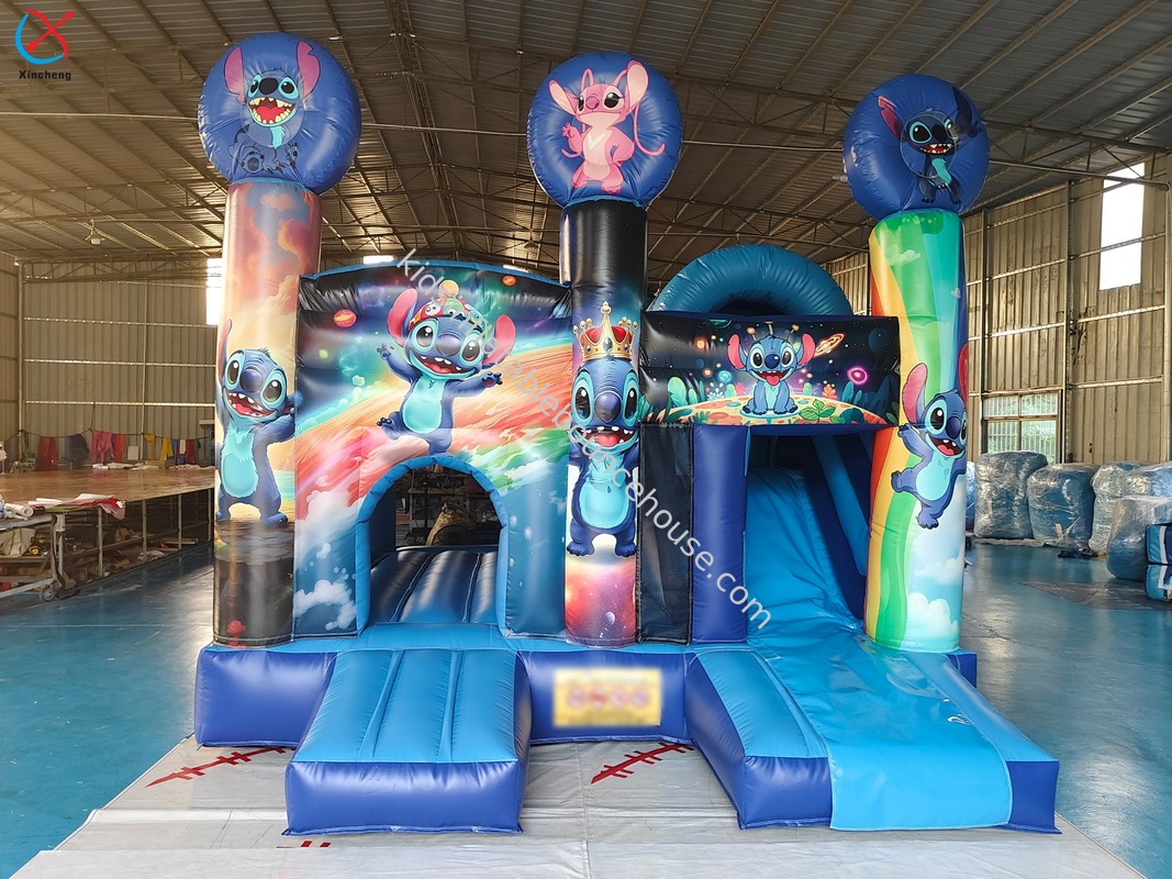 Commercial-grade bouncy castle featuring the popular Lilo & Stitch theme, complete with an integrated slide for enhanced play value.