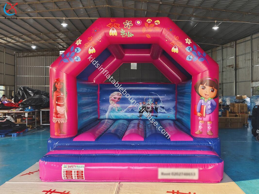 Professional-grade inflatable bounce house featuring a vibrant pink princess theme, designed specifically for commercial use and children's entertainment.