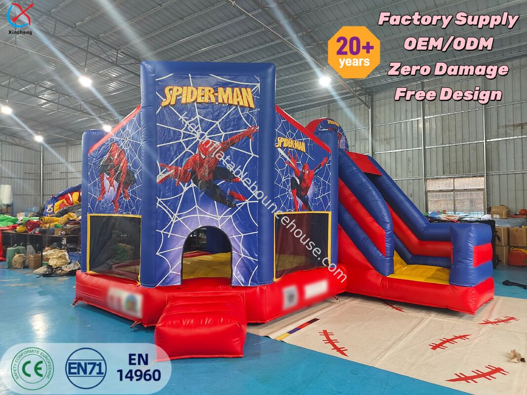 This action-packed Spider-Man inflatable bounce house features bold web patterns and dynamic superhero graphics, paired with an exciting slide for non-stop play. It's a durable, eye-catching play structure that brings the thrill of Spider-Man to kids' parties, offering hours of safe, bouncing fun.