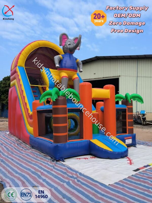 This exciting elephant-themed inflatable bounce house features vibrant graphics and a slide obstacle design, creating an immersive play experience for children. The rugged construction ensures safe bouncing and sliding fun at parties and events.